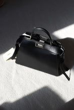 Add a touch of elegance to your outfit with this Fendi Peekaboo handbag. Crafted from high-quality calf leather, this small top handle bag features a turn lock closure and a detachable strap for versatile carrying options. The black exterior is accented with silver hardware and a patent finish, giving it a chic and sophisticated look.